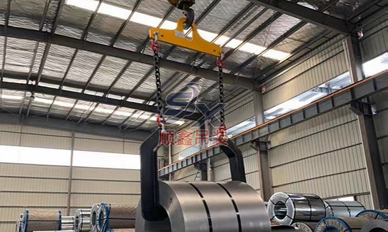 翻轉(zhuǎn)吊具通過機(jī)械剪力原理,對立式擺放的卷鋼進(jìn)行單邊抓取,來完成卷鋼的裝卸,當(dāng)改變重力點時,可以對卷鋼進(jìn)行翻轉(zhuǎn),作業(yè)時不傷鋼卷。其吊耳采用加厚處理,焊縫飽滿牢固、延長使用壽命。
